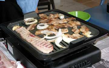 Today I packed up the Joycook “Rosta” grill and headed down to Salt Lake to meet with Hae An, Joel, and Hang for some Samkyupsal. Man, that was, as Joel said, one of the best Korean meals I’ve had in the states. It was much like the time before when we had it, except this time Hae An grabbed some kimchi from his friend’s apartment, and it was freakin’ good kimchi– the best / most authentic I’ve had in the states as well. So in addition to the meat, onions, and garlic on the grill, we also thew on some kimchi and added that to the lettuce wraps– I thought I had died and gone to heaven. A strange thing to me about Korean food is that in cases like this, it leaves me craving more instead of satisfying me for a while. I can hardly wait to make samkyupsal again…