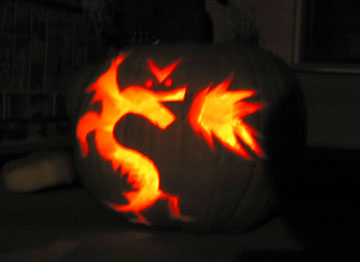 So they had a pumpkin carving contest after institute today, and I had no idea what to carve. Of course what did I end up doing, but a Trogdor jack-o-lantern. I did the best I could from memory, it’s off a bit, a little lacking in the majesty department after having come home and compared it to the real trogdor– that and it got a little sloppy with the spineties and wings and what not, but I still get a kick out of it, hehe. Anyways I won “Scariest”, woo! You’d be suprised how many people are less creative than me– I just used an image from homestarrunner.com, hehe. I guess my pumpkin had more majesty than I thought ๐